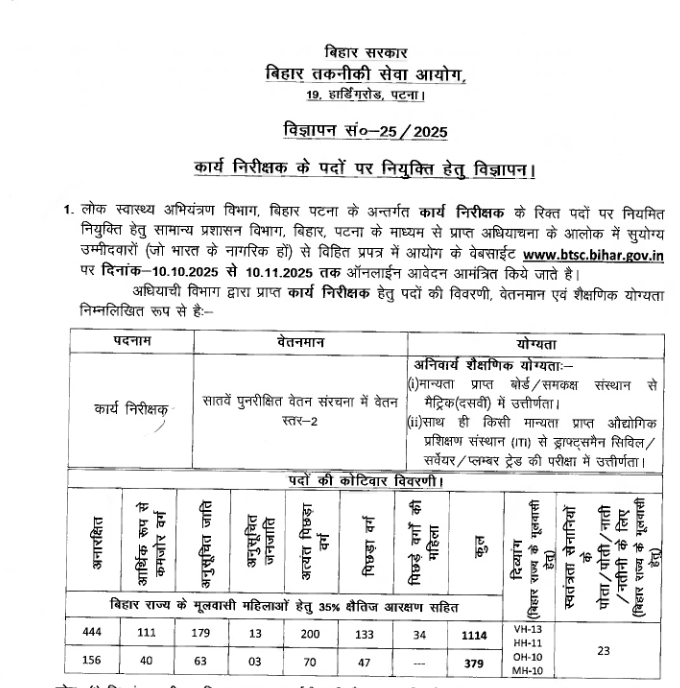 ๐Ÿ”” Bihar BTSC Work Inspector Recruitment 2025 – 1114 Vacancies